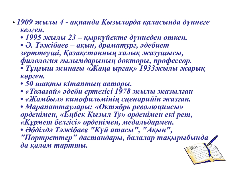 жылы 23 – қыркүйекте дүниеден өткен. • Ә. Тәжібаев – ақын, драматург, әдебиет зерттеуші, Қазақстанның халық жазушысы, филология ғылымдарының докторы, профессор. • Тұңғыш жинағы «Жаңа ырғақ» 1933жылы жарық көрген. • 50 шақты кітаптың авторы. • «Толағай» әдеби ертегісі 1978 жылы жазылған • «Жамбыл» кинофильмінің сценарийін жазған. • Марапаттаулары: «Октябрь революциясы» орденімен, «Еңбек Қызыл Ту» орденімен екі рет, «Құрмет белгісі» орденімен, медальдармен. • Әбділдә Тәжібаев "Күй атасы", "Ақын", "Портреттер" дастандары, балалар тақырыбында да қалам тартты.