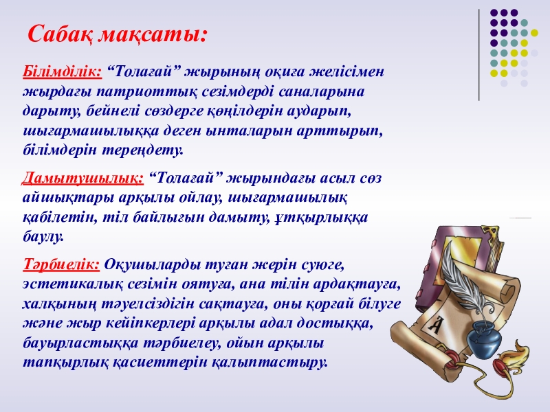 Сабақ мақсаты:Білімділік: “Толағай” жырының оқиға желісімен жырдағы патриоттық сезімдерді саналарына дарыту, бейнелі сөздерге қөңілдерін аударып, шығармашылыққа деген
