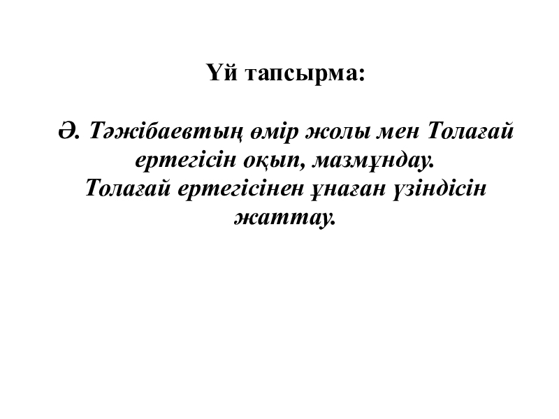 Үй тапсырма:  Ә. Тәжібаевтың өмір жолы мен Толағай ертегісін оқып, мазмұндау. Толағай ертегісінен ұнаған үзіндісін жаттау.
