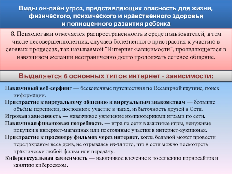 8. Психологами отмечается распространенность в среде пользователей, в том числе несовершеннолетних, случаев болезненного пристрастия к участию в сетевых процессах, так называемой "Интернет-зависимости", проявляющегося в навязчивом желании неограниченно долго продолжать сетевое общение.