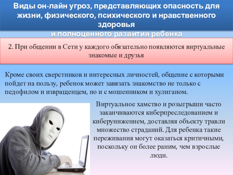 Виртуальное хамство и розыгрыши часто заканчиваются киберпреследованием и киберунижением, доставляя объекту травли множество страданий. Для ребенка такие переживания могут оказаться критичными, поскольку он более раним, чем взрослые люди.