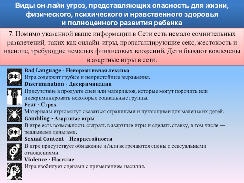 7. Помимо указанной выше информации в Сети есть немало сомнительных развлечений, таких как онлайн-игры, пропагандирующие секс, жестокость и насилие, требующие немалых финансовых вложений. Дети бывают вовлечены в азартные игры в сети.