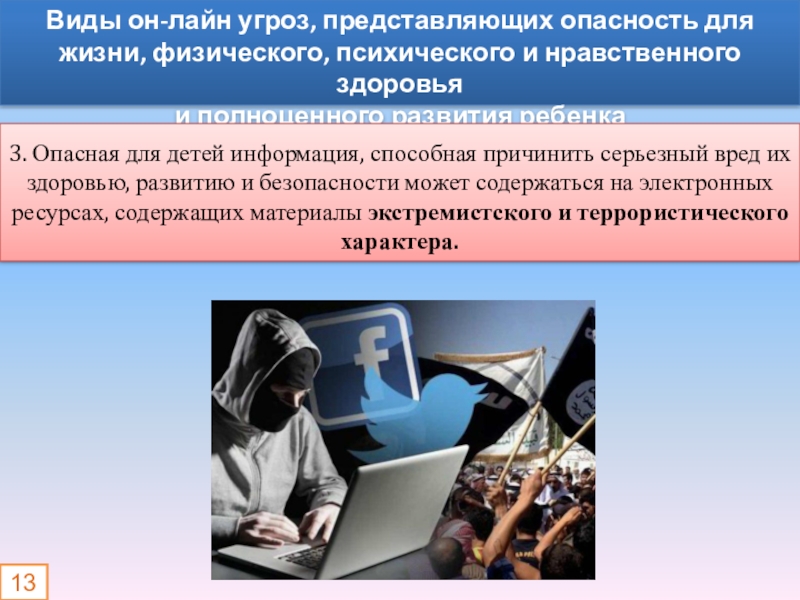 3. Опасная для детей информация, способная причинить серьезный вред их здоровью, развитию и безопасности может содержаться на электронных ресурсах, содержащих материалы экстремистского и террористического характера.