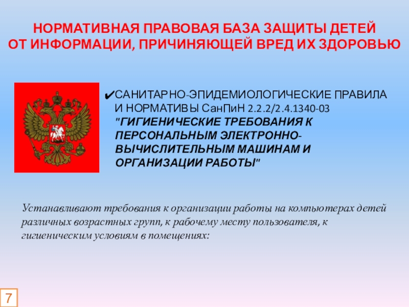 Устанавливают требования к организации работы на компьютерах детей различных возрастных групп, к рабочему месту пользователя, к гигиеническим условиям в помещениях: