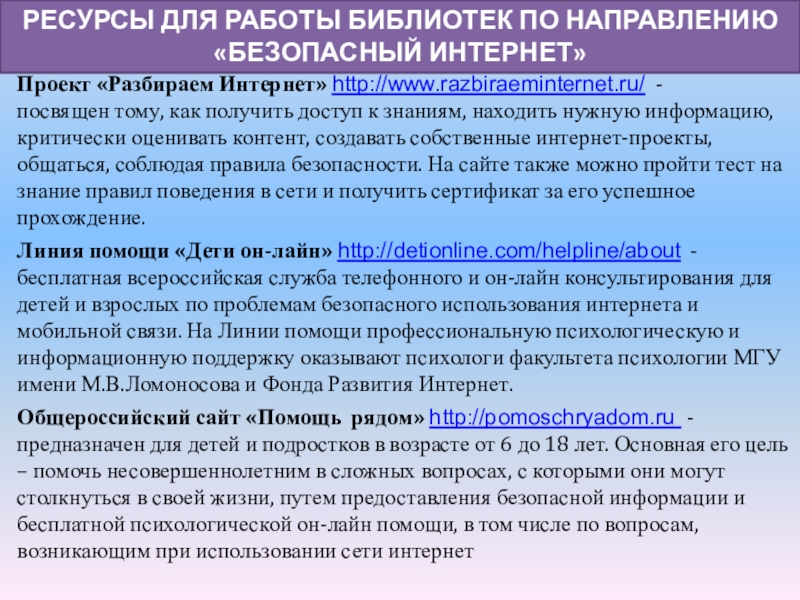 РЕСУРСЫ ДЛЯ РАБОТЫ БИБЛИОТЕК ПО НАПРАВЛЕНИЮ