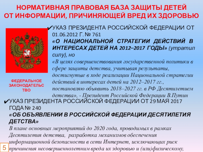 В плане основных мероприятий до 2020 года, проводимых в рамках Десятилетия детства, разработка механизмов обеспечения информационной безопасности в сети Интернет, исключающих риск причинения несовершеннолетним вреда их здоровью и (или)физическому, психическому, духовному, нравственному развитию.