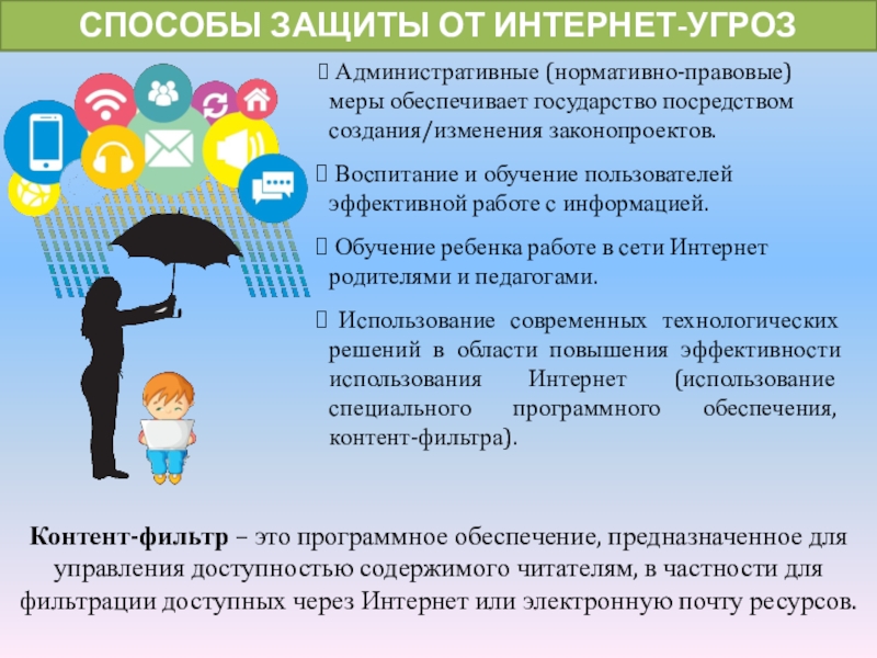 Контент-фильтр – это программное обеспечение, предназначенное для управления доступностью содержимого читателям, в частности для фильтрации доступных через Интернет или электронную почту ресурсов.