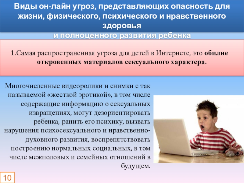 Многочисленные видеоролики и снимки с так называемой «жесткой эротикой», в том числе содержащие информацию о сексуальных извращениях, могут дезориентировать ребенка, ранить его психику, вызвать нарушения психосексуального и нравственно-духовного развития, воспрепятствовать построению нормальных социальных, в том числе межполовых и семейных отношений в будущем.