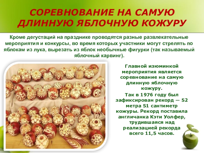 Слайд 4СОРЕВНОВАНИЕ НА САМУЮ ДЛИННУЮ ЯБЛОЧНУЮ КОЖУРУ