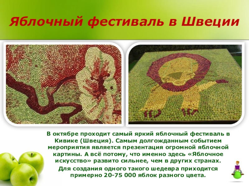 Кивике (Швеция). Самым долгожданным событием мероприятия является презентация огромной яблочной картины. А всё потому, что именно здесь «Яблочное искусство» развито сильнее, чем в других странах.