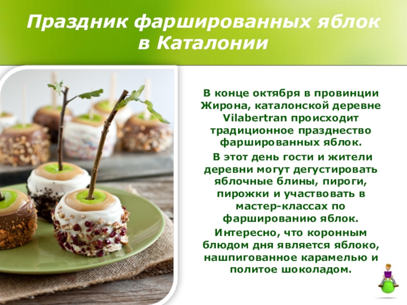 Интересно, что коронным блюдом дня является яблоко, нашпигованное карамелью и политое шоколадом.