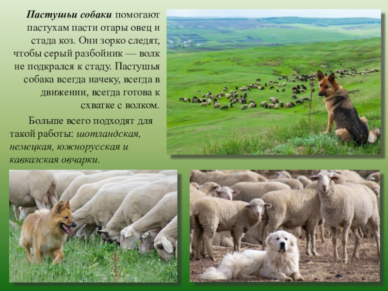 Больше всего подходят для такой работы: шотландская, немецкая, южнорусская и кавказская овчарки.