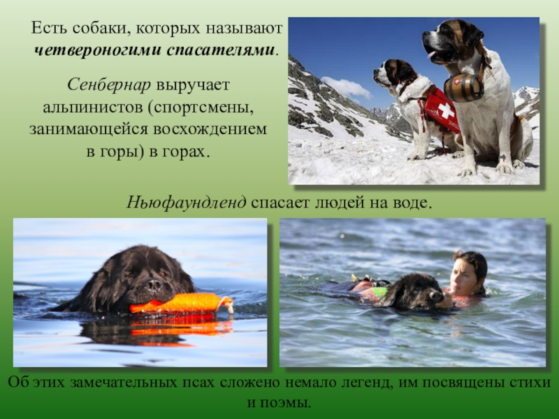 Сенбернар выручает альпинистов (спортсмены, занимающейся восхождением в горы) в горах.