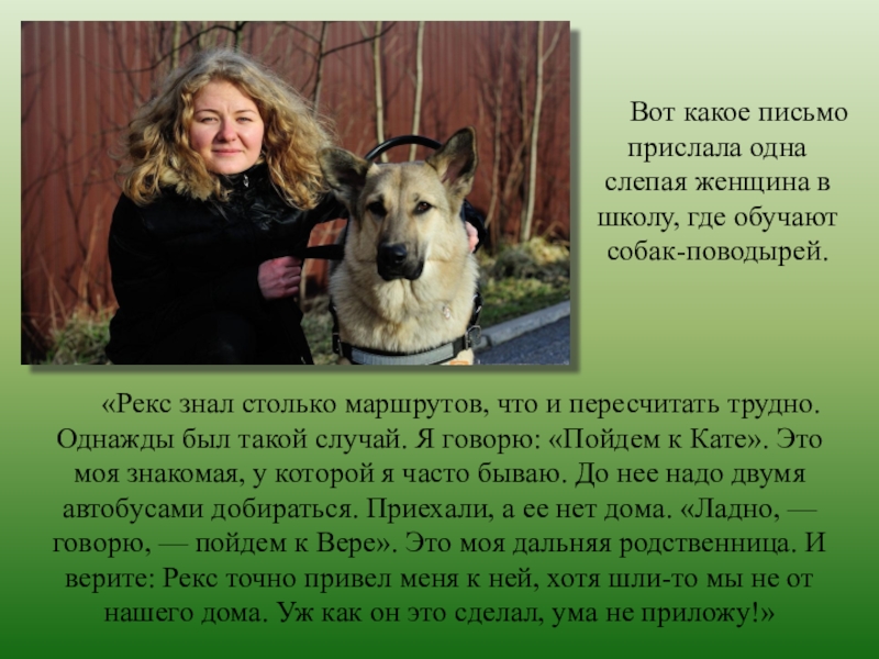 Вот какое письмо прислала одна слепая женщина в школу, где обучают собак-поводырей.