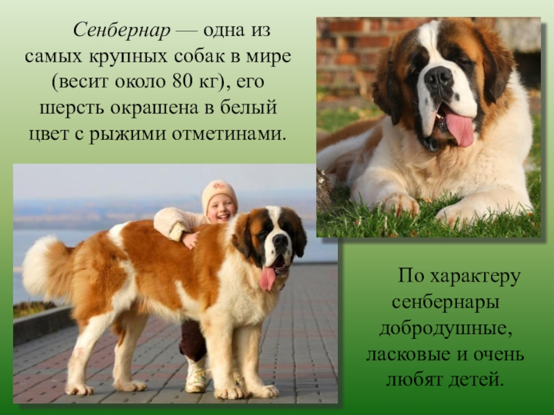 По характеру сенбернары добродушные, ласковые и очень любят детей.