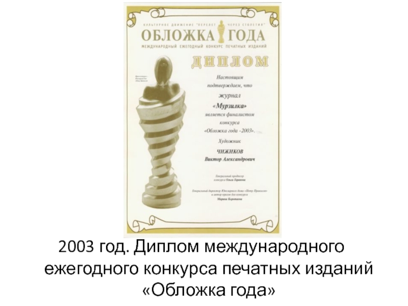 Слайд 112003 год. Диплом международного ежегодного конкурса печатных изданий «Обложка года»