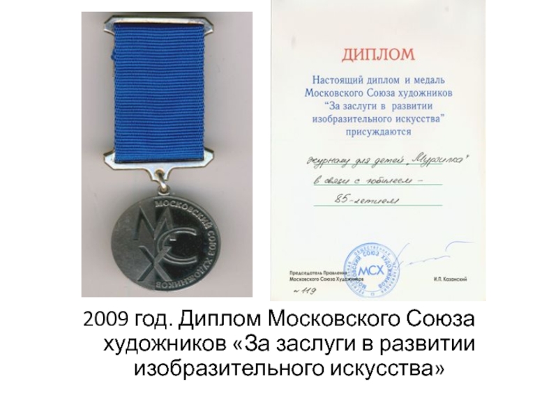 Слайд 122009 год. Диплом Московского Союза художников «За заслуги в развитии изобразительного
