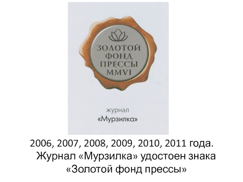 Слайд 92006, 2007, 2008, 2009, 2010, 2011 года. Журнал «Мурзилка» удостоен знака