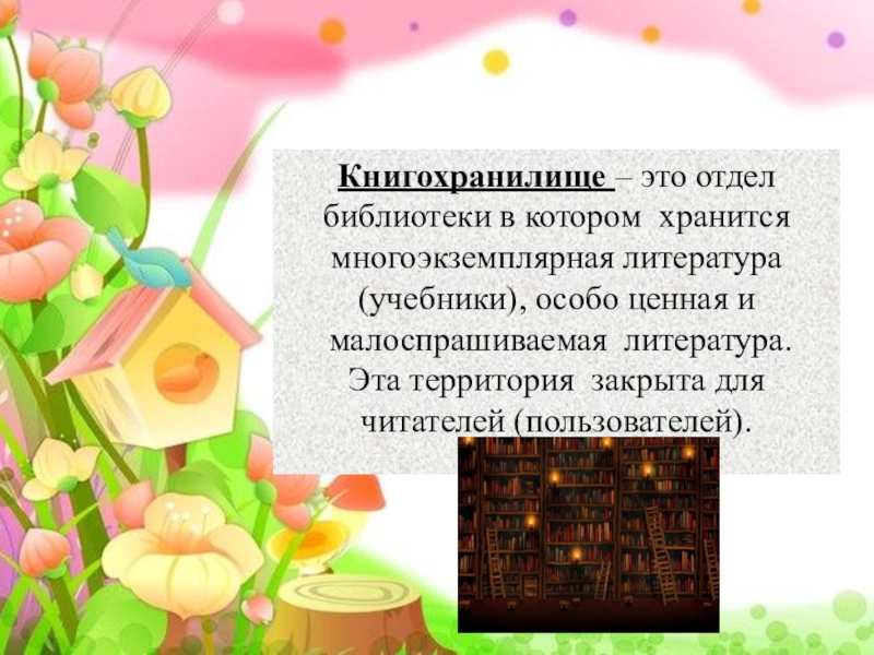 Слайд 25Книгохранилище – это отдел библиотеки в котором хранится многоэкземплярная литература (учебники), особо