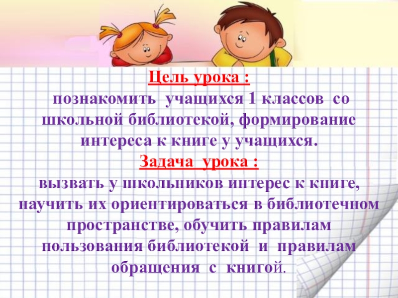 вызвать у школьников интерес к книге, научить их ориентироваться в библиотечном пространстве, обучить правилам пользования библиотекой и правилам обращения с книгой.