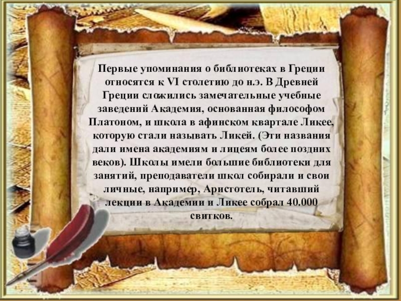 Слайд 7Первые упоминания о библиотеках в Греции относятся к VI столетию до