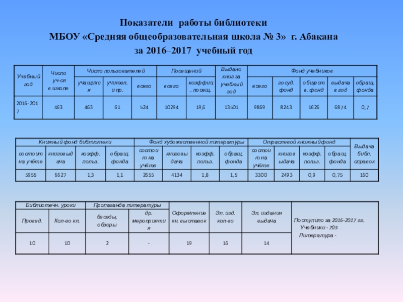 Показатели работы библиотекиМБОУ «Средняя общеобразовательная школа № 3» г. Абаканаза 2016–2017 учебный год