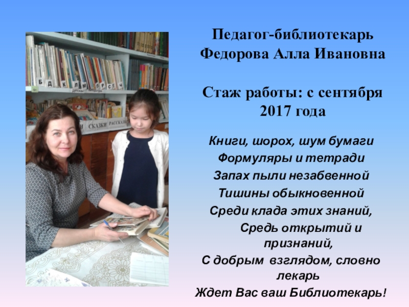 Педагог-библиотекарь Федорова Алла ИвановнаСтаж работы: с сентября 2017 годаКниги, шорох, шум бумагиФормуляры и тетрадиЗапах пыли незабвеннойТишины обыкновеннойСреди клада этих знаний, Средь открытий и признаний,С добрым взглядом, словно лекарьЖдет Вас ваш Библиотекарь!