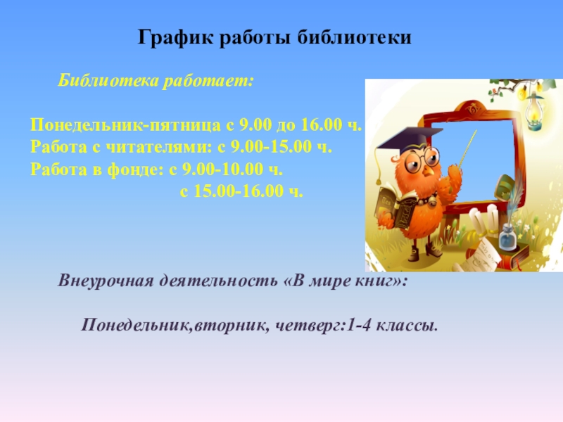 График работы библиотекиБиблиотека работает: 	Понедельник-пятница с 9.00 до 16.00 ч.Работа с читателями: с 9.00-15.00 ч.Работа в фонде: