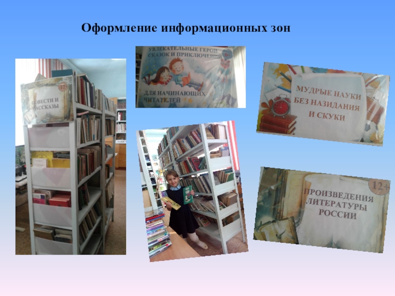 Читальный зал со столами для занятийЗонирование помещения школьной библиотекиСтеллажи открытого доступа к энциклопедиям, справочникам