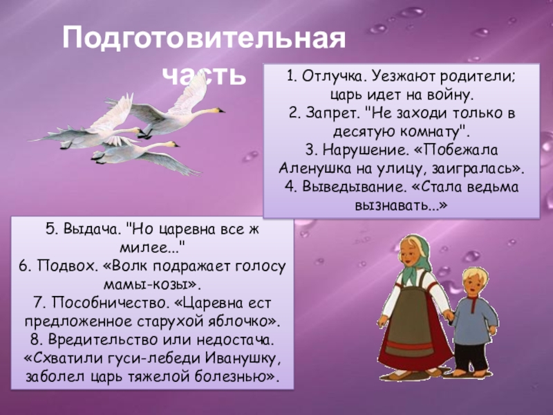 2) Запрет (Мать наказывает Красной Шапочке, чтобы она, идя к бабушке, не сходила с тропинки)