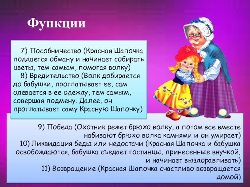 8) Вредительство (Волк добирается до бабушки, проглатывает ее, сам одевается в ее одежду, тем самым, совершая подмену. Далее, он проглатывает саму Красную Шапочку)