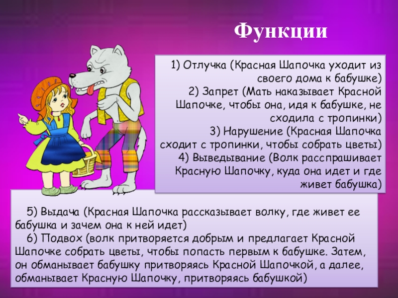 4) Выведывание (Волк расспрашивает Красную Шапочку, куда она идет и где живет бабушка)