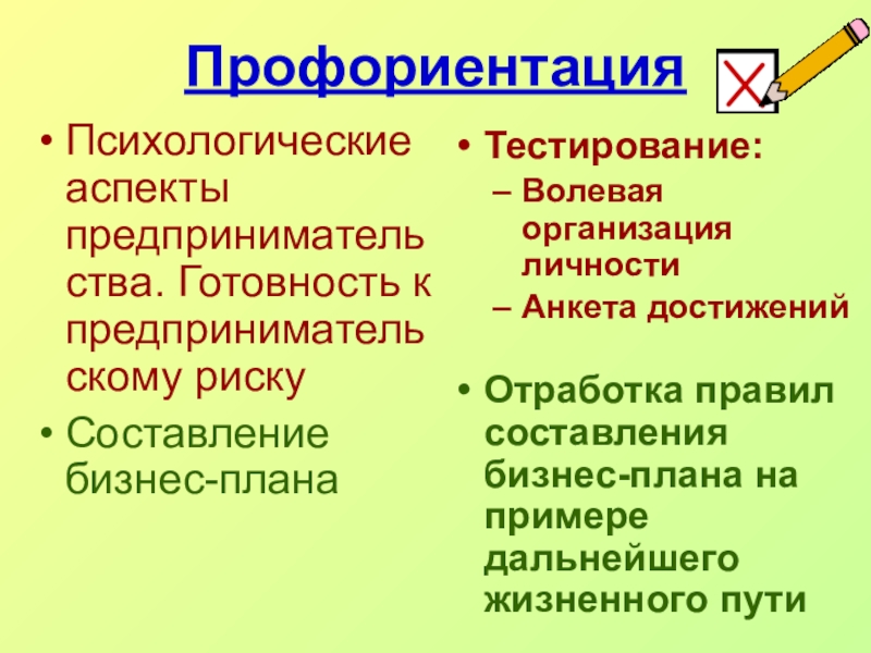 Профориентация Психологические аспекты предпринимательства. Готовность к предпринимательскому рискуСоставление бизнес-планаТестирование:Волевая организация личностиАнкета достижений	Отработка правил составления бизнес-плана на примере