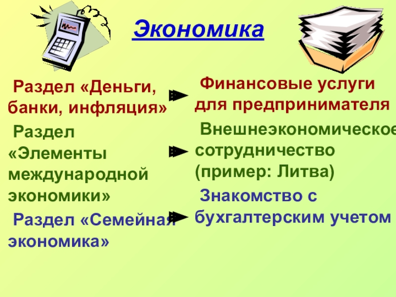 Экономика	Раздел «Деньги, банки, инфляция»	Раздел «Элементы международной экономики»	Раздел «Семейная экономика»	Финансовые услуги для предпринимателя	Внешнеэкономическое сотрудничество (пример: Литва)	Знакомство с бухгалтерским