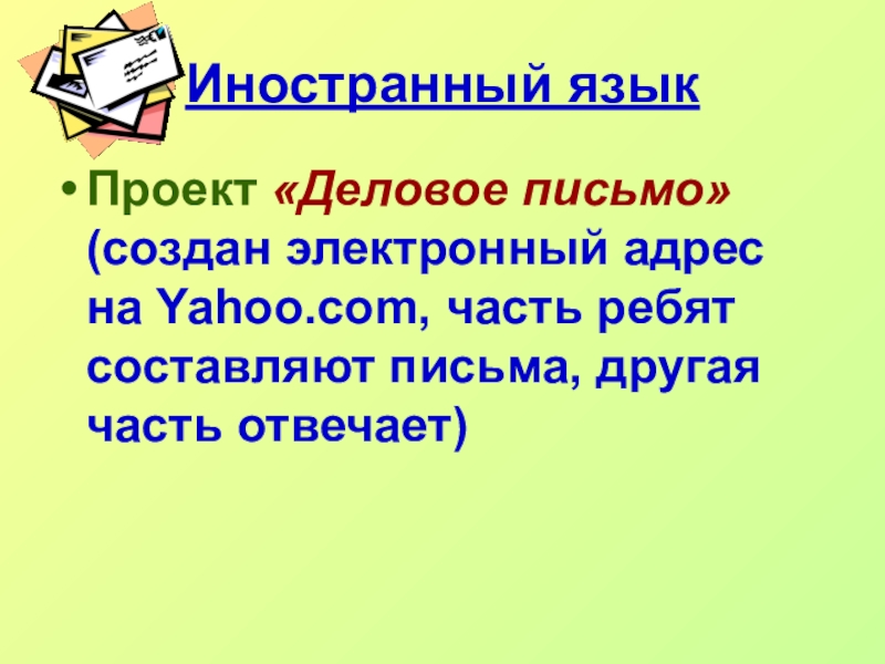 Иностранный языкПроект «Деловое письмо» (создан электронный адрес на Yahoo.com, часть ребят составляют письма, другая часть отвечает)