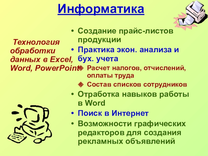 Информатика	Технология обработки данных в Excel, Word, PowerPointСоздание прайс-листов продукцииПрактика экон. анализа и бух. учетаРасчет налогов, отчислений, оплаты