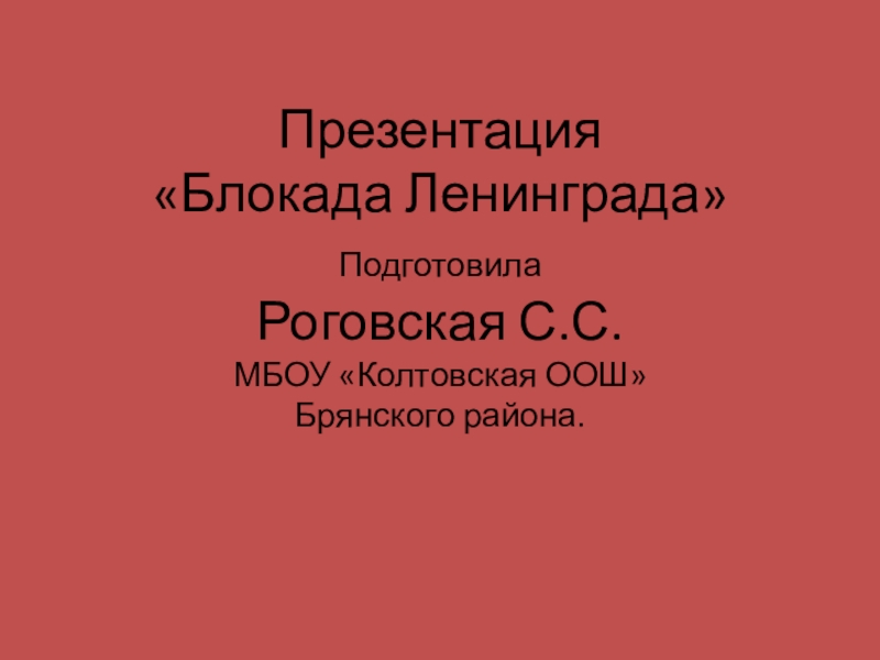 Слайд 1 Презентация «Блокада Ленинграда» Подготовила Роговская С.С. МБОУ «Колтовская ООШ» Брянского района.