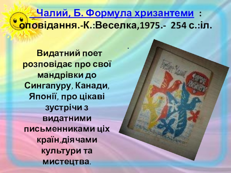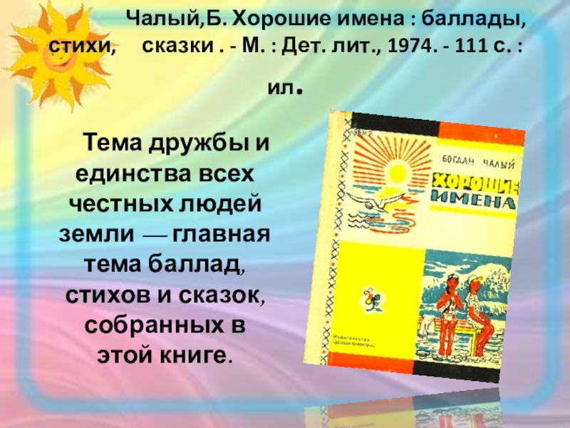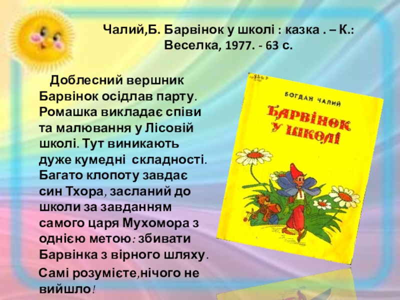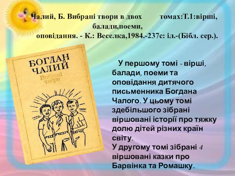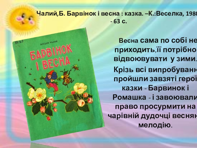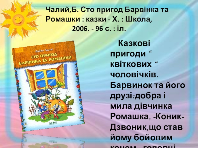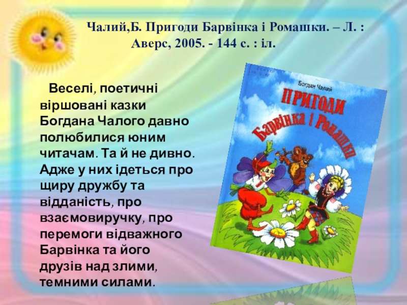 Веселі, поетичні віршовані казки Богдана Чалого давно полюбилися юним читачам. Та й не дивно. Адже у них ідеться про щиру дружбу та відданість, про взаємовиручку, про перемоги відважного Барвінка та його друзів над злими, темними силами.