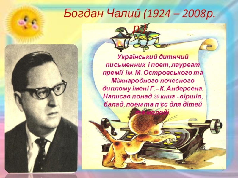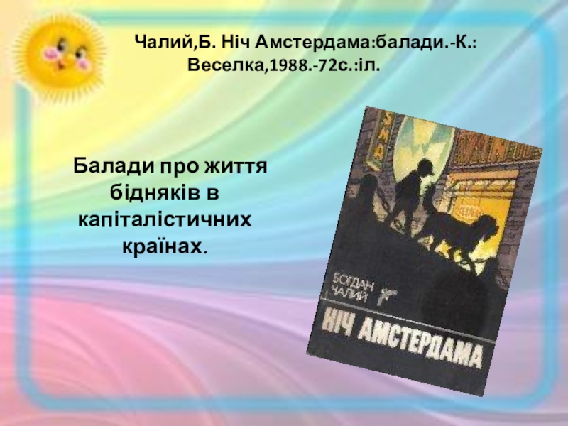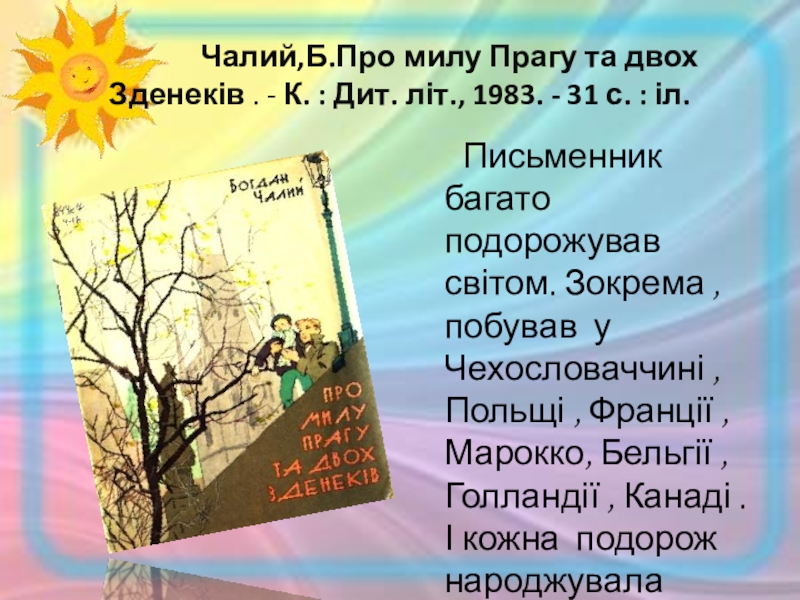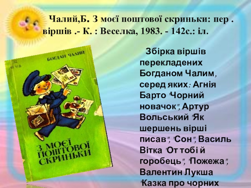 Збірка віршів перекладених Богданом Чалим, серед яких: Агнія Барто "Чорний новачок", Артур Вольський "Як шершень вірші писав", "Сон", Василь Вітка "От тобі й горобець", "Пожежа", Валентин Лукша "Казка про чорних лелек", Максим Танк "Кінь і лев" та інші.