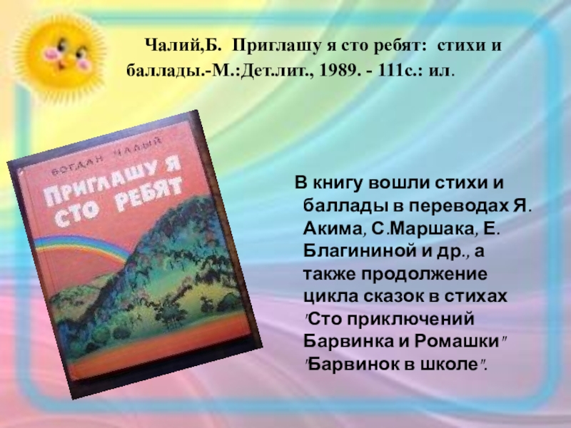 В книгу вошли стихи и баллады в переводах Я.Акима, С.Маршака, Е.Благининой и др., а также продолжение цикла сказок в стихах "Сто приключений Барвинка и Ромашки" "Барвинок в школе".