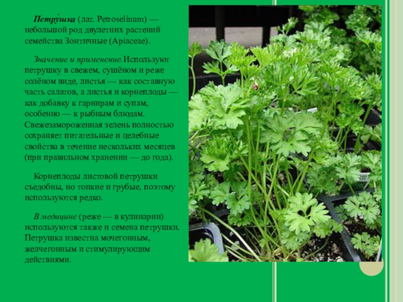 Слайд 15 Петру́шка (лат. Petroselínum) — небольшой род двулетних растений семейства