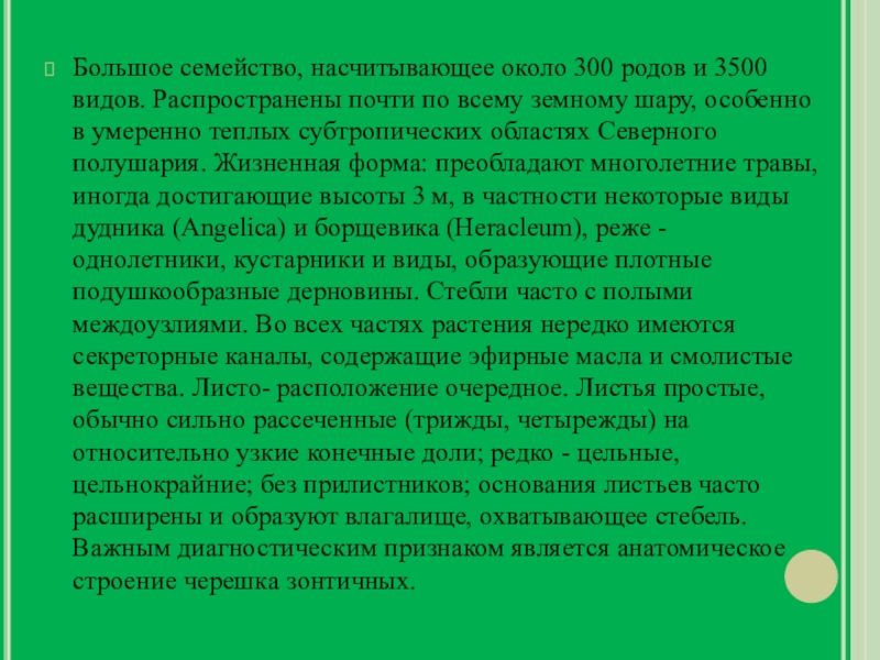 по всему земному шару, особенно в умеренно теплых субтропических областях Северного полушария. Жизненная форма: преобладают многолетние травы, иногда достигающие высоты 3 м, в частности некоторые виды дудника (Angelica) и борщевика (Heracleum), реже - однолетники, кустарники и виды, образующие плотные подушкообразные дерновины. Стебли часто с полыми междоузлиями. Во всех частях растения нередко имеются секреторные каналы, содержащие эфирные масла и смолистые вещества. Листо- расположение очередное. Листья простые, обычно сильно рассеченные (трижды, четырежды) на относительно узкие конечные доли; редко - цельные, цельнокрайние; без прилистников; основания листьев часто расширены и образуют влагалище, охватывающее стебель. Важным диагностическим признаком является анатомическое строение черешка зонтичных.