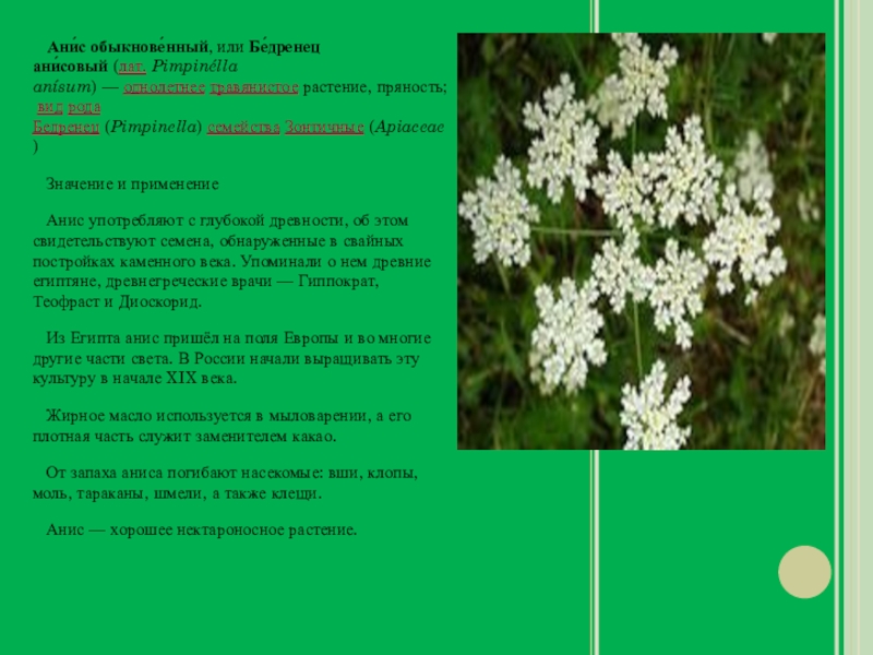 Слайд 12 Ани́с обыкнове́нный, или Бе́дренец ани́совый (лат. Pimpinélla anísum) — однолетнее травянистое растение, пряность; вид рода Бедренец (Pimpinella) семейства Зонтичные (Apiaceae)