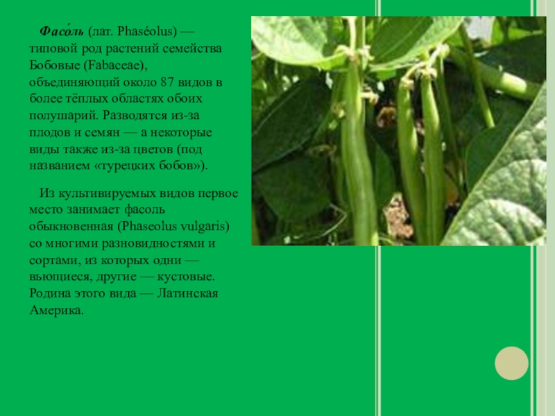 Слайд 5 Фасо́ль (лат. Phaséolus) — типовой род растений семейства Бобовые
