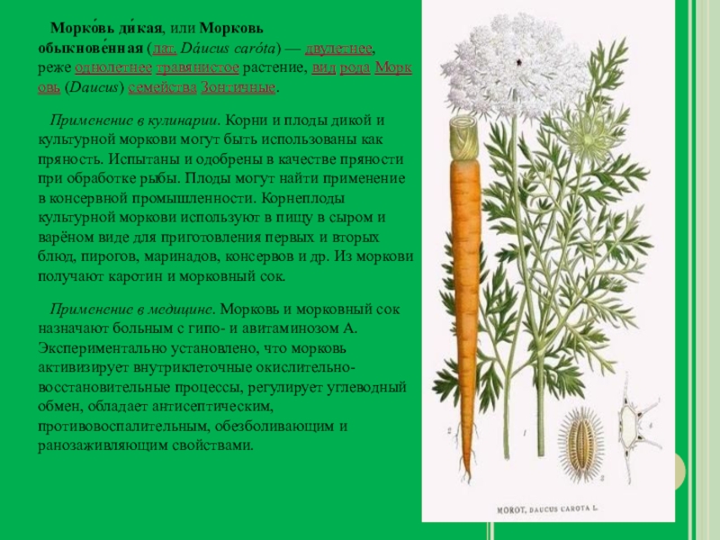 Слайд 14 Морко́вь ди́кая, или Морковь обыкнове́нная (лат. Dáucus caróta) — двулетнее,реже однолетнее травянистое растение, вид рода Морковь (Daucus) семейства Зонтичные.