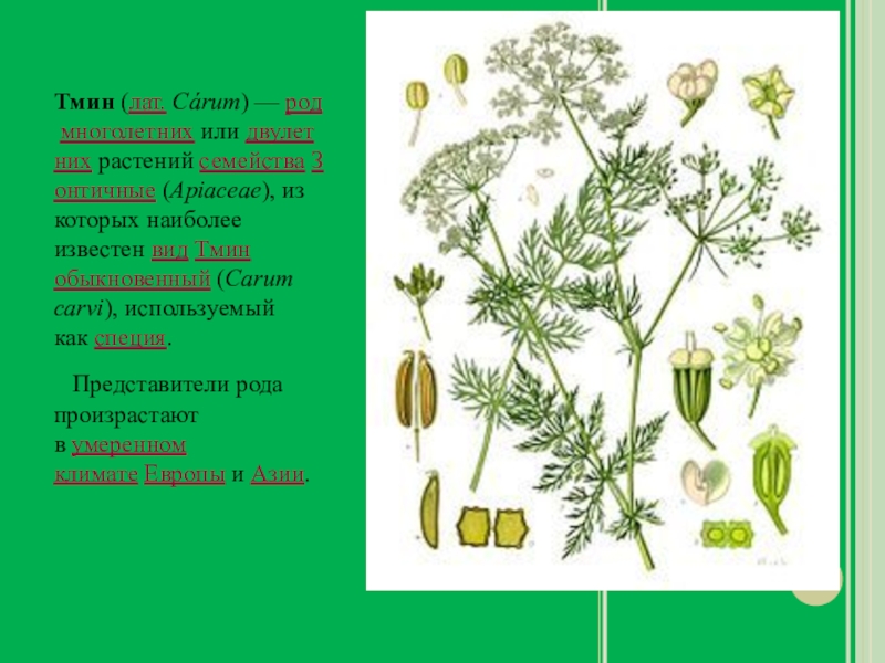 Слайд 11 Тмин (лат. Cárum) — род многолетних или двулетних растений семейства Зонтичные (Apiaceae), из которых наиболее известен вид Тмин обыкновенный (Carum carvi), используемый как специя.