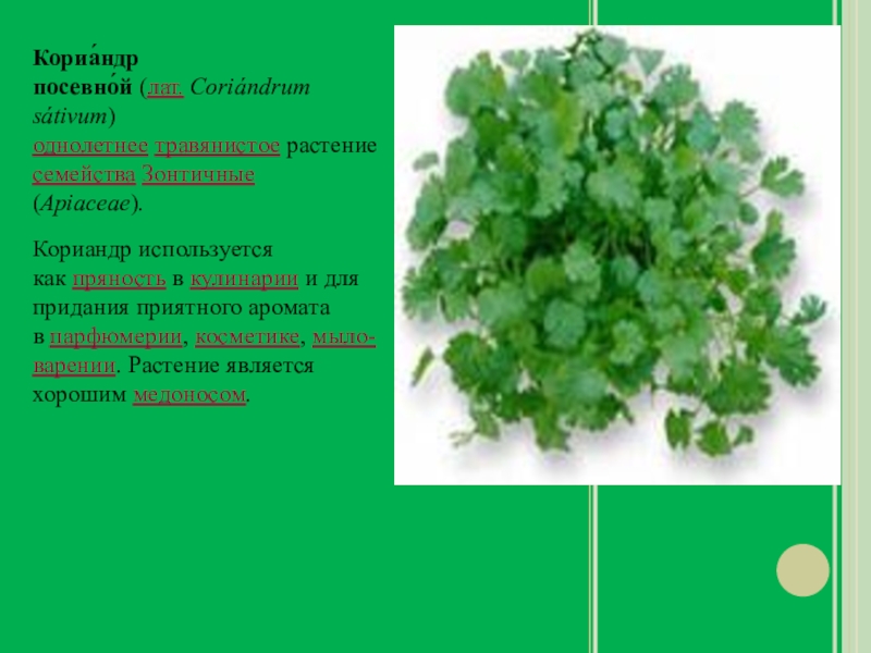 Слайд 13Кориа́ндр посевно́й (лат. Coriándrum sátivum) однолетнее травянистое растение семейства Зонтичные (Apiaceae).