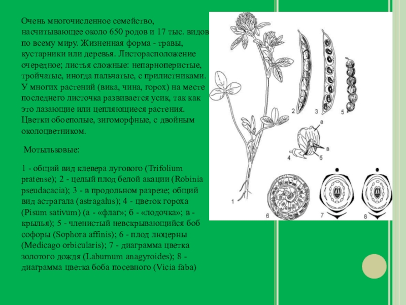 1 - общий вид клевера лугового (Trifolium pratense); 2 - целый плод белой акации (Robinia pseudacacia); 3 - в продольном разрезе; общий вид астрагала (astragalus); 4 - цветок гороха (Pisum sativum) (а - «флаг»; б - «лодочка»; в - крылья); 5 - членистый невскрывающийся боб софоры (Sophora affinis); 6 - плод люцерны (Medicago orbicularis); 7 - диаграмма цветка золотого дождя (Laburnum anagyroides); 8 - диаграмма цветка боба посевного (Vicia faba)