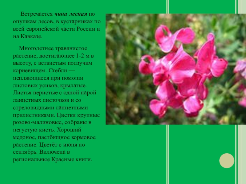 Слайд 7 Встречается чина лесная по опушкам лесов, в кустарниках