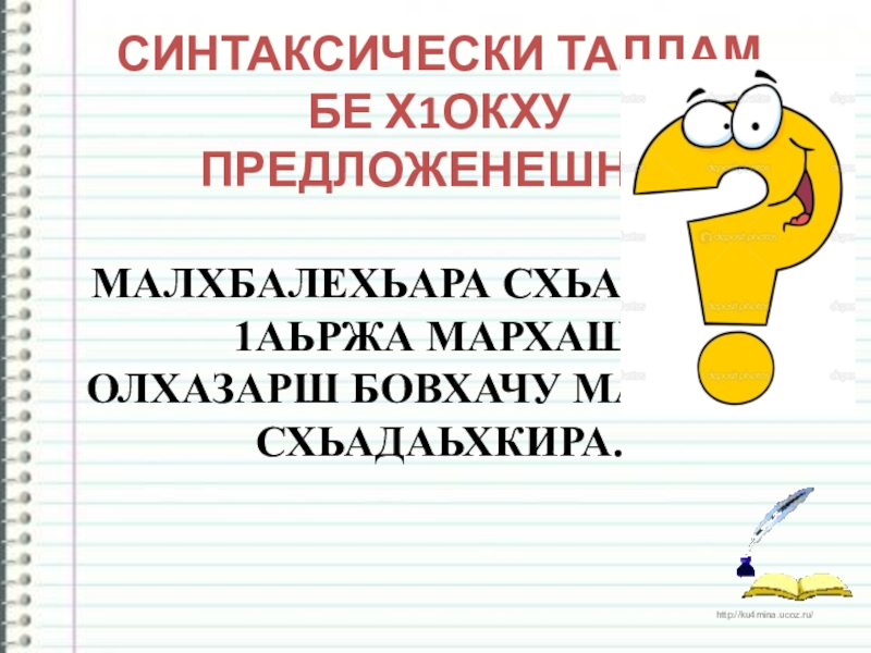 Слайд 13Синтаксически таллам бе х1окху предложенешна: Малхбалехьара схьаевлира 1аьржа мархаш. Олхазарш бовхачу махкара